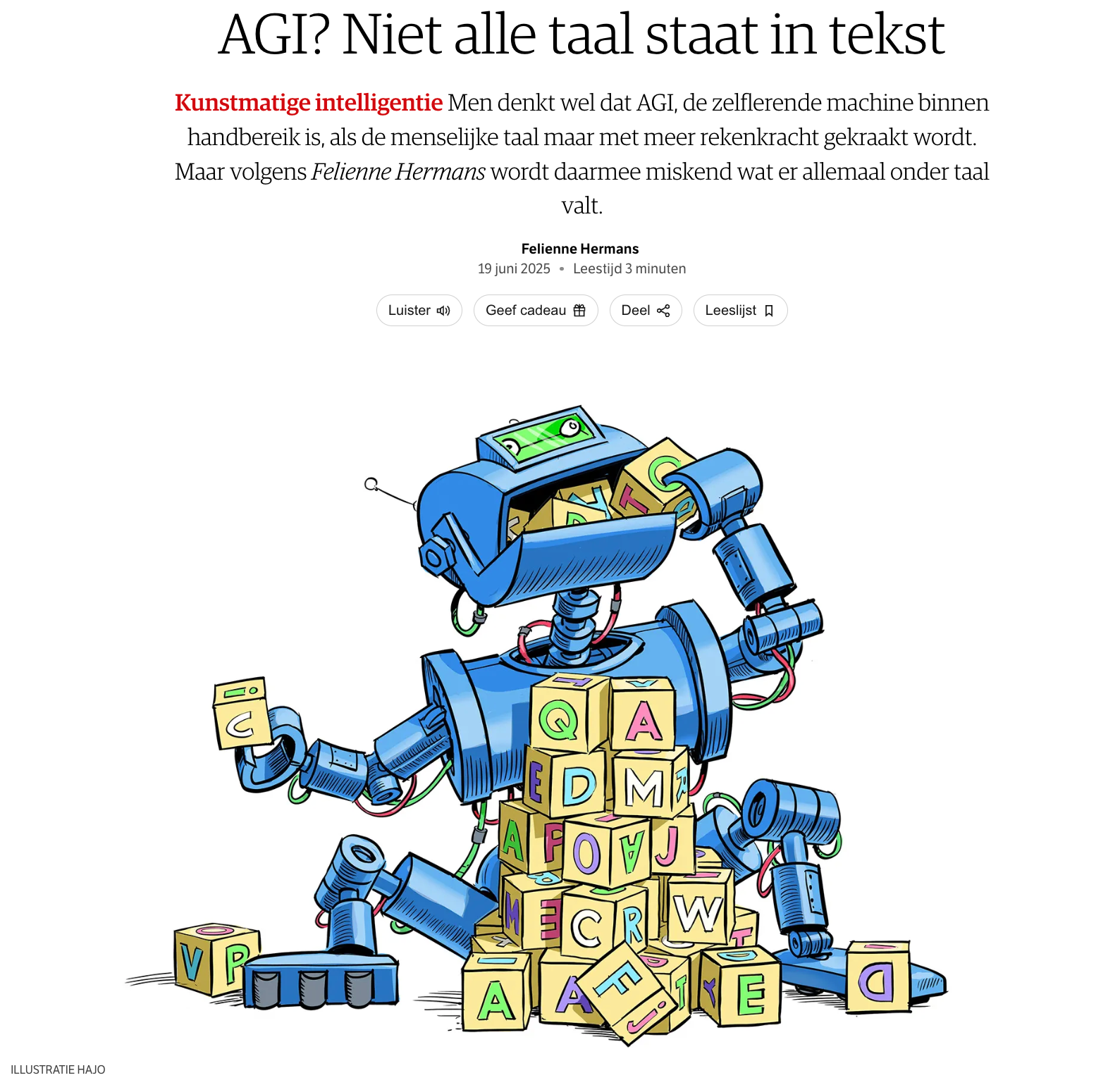 Voor NRC schreef ik een stuk over wat taal eigenlijk is. Door AGI gaan we denken dat het veel smaller is dan wat een mens allemaal doet.