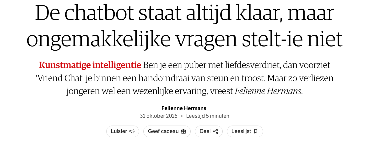 31 okt. 2025 NRC - 31 oktober 2025 Voor NRC schreef ik een stuk over opvoeden nu er AI is.Lees het stuk in NRC of paywallvrij via archive.ph.
