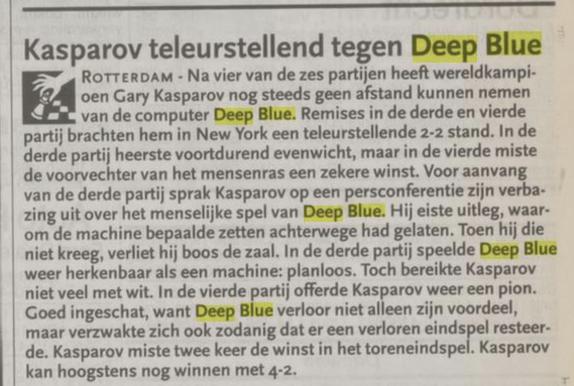 Schaken, heel lang was het de toets voor intelligentie, voor mensen natuurlijk, maar ook voor machines! Tot de jaren 90 werd gedacht dat als we schaken opgelost hadden, dat we er dan wel een beetje waren met AI. Het is leuk om in oude kranten te zoeken naar krantenartikelen uit die tijd op mijn favoriete website van het Nederlandse internet natuurlijk; Delpher! Dit stuk bijvoorbeeld uit het Algemeen Dagblad van 9 mei 1997, ten tijden van de partijen die Kasparov tegen Deep Blue speelde (die Kasparov uiteindelijk verloor met 3½–2½).