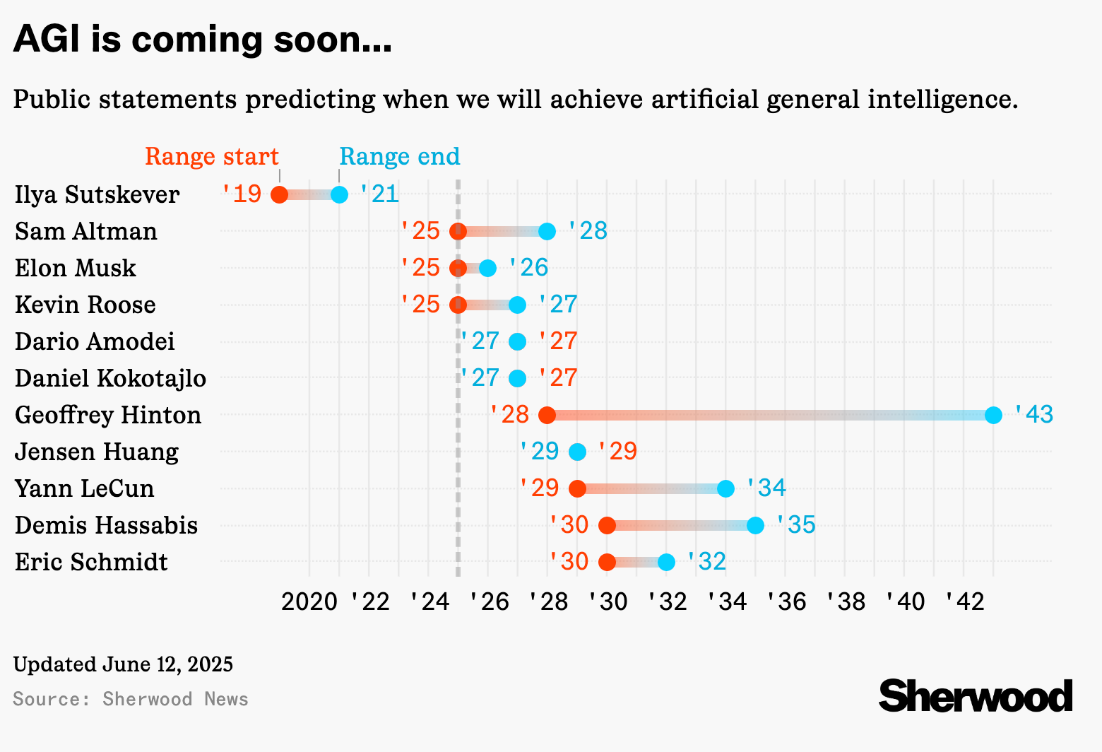 En wie dat natuurlijk heel anders ziet zijn... de heren uit Silicon Valley! Ja, AGI komt er al bijna aan. Op deze geestige website kan je bekijken wie wat allemaal voorspeld heeft.