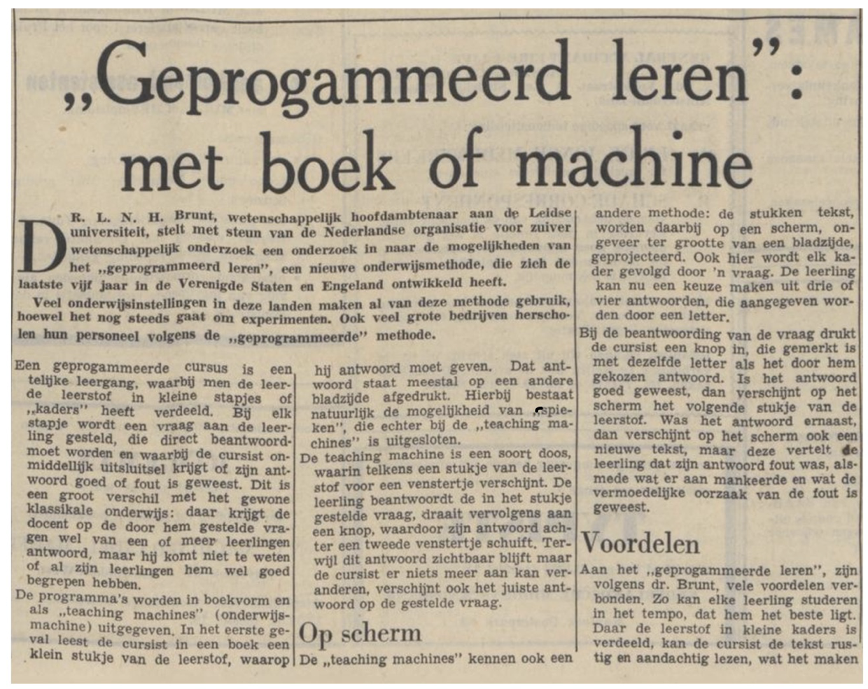 "Aan het geprogrammeerde leren zijn, volgens Dr. Brunt vele voordelen verbonden. Zo kan elke leerling studeren in het tempo, dat hem het beste ligt."