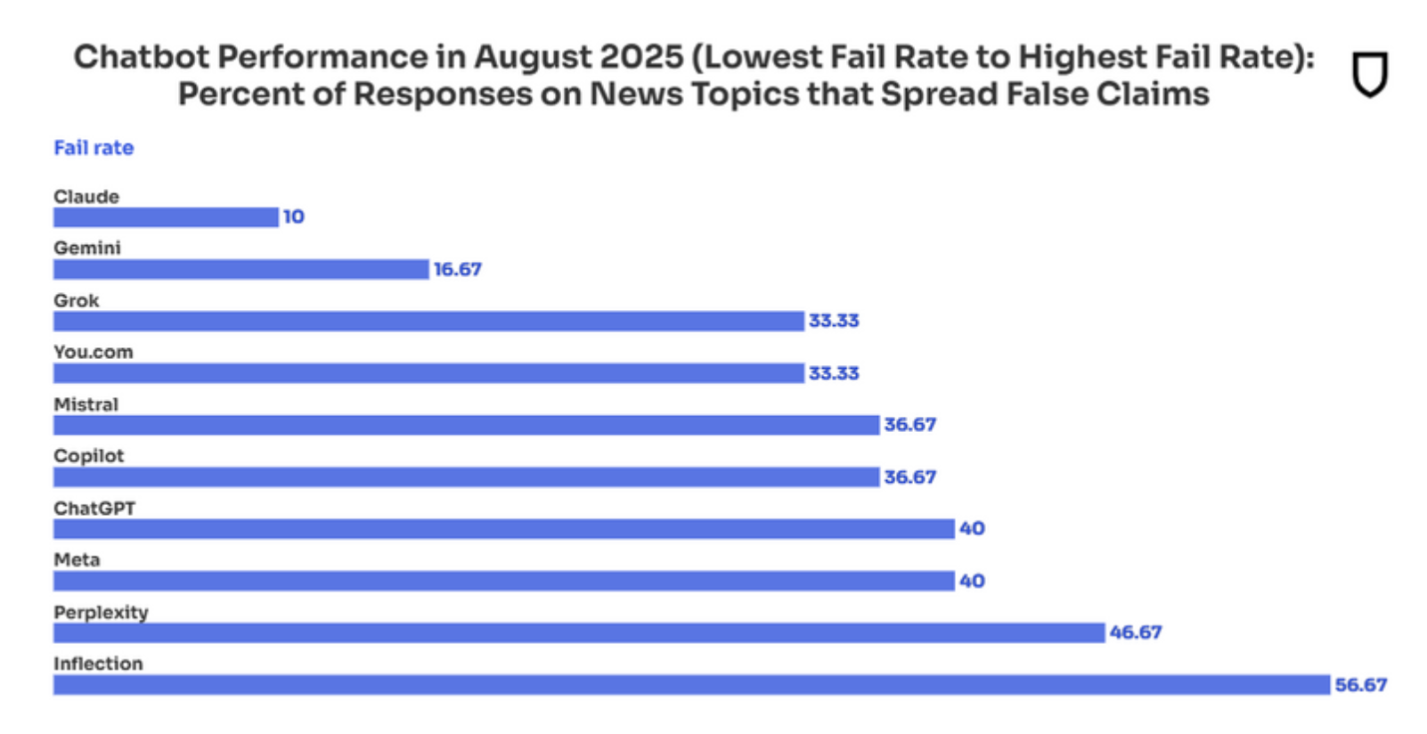 Er is trouwens veel verschil tussen de verschillende chatbots, van 10% fake news bij Claude tot wel 57% bij Inflection (van de chatbot Pi).