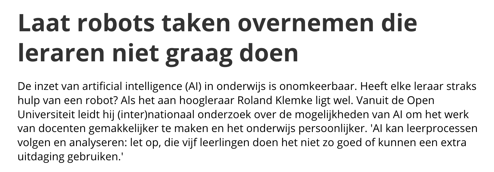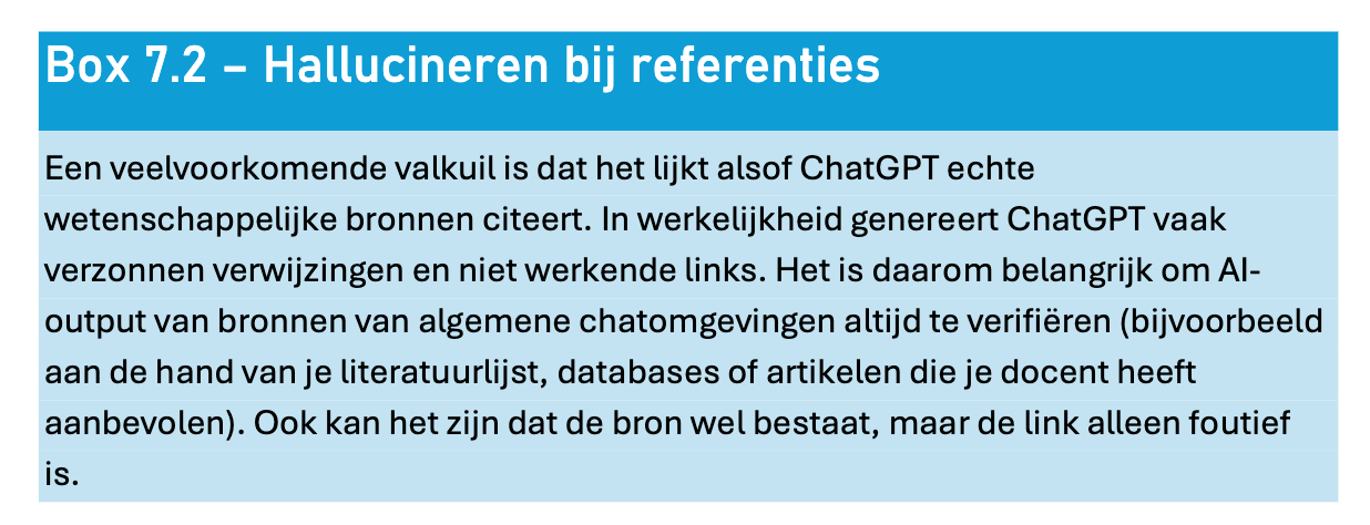 Een tool die vaak verkeerde antwoorden geeft, waarom willen we die gebruiken? Bovenstaand stuk komt trouwens uit een hoofdstuk over Literatuuronderzoek, maar wat is het probleem waar studenten tegenaanlopen dan, waarvoor ChatGPT de oplossing is. We hebben toch al goede databases met bestaand, kloppend werk waarin studenten kunnen zoeken, bijvoorbeeld via de bibliotheek. Geen woord wordt in het stuk besteed aan uitleggen waarvoor AI een oplossing is, waarom een docent of een student dit zou willen integreren in een vak!