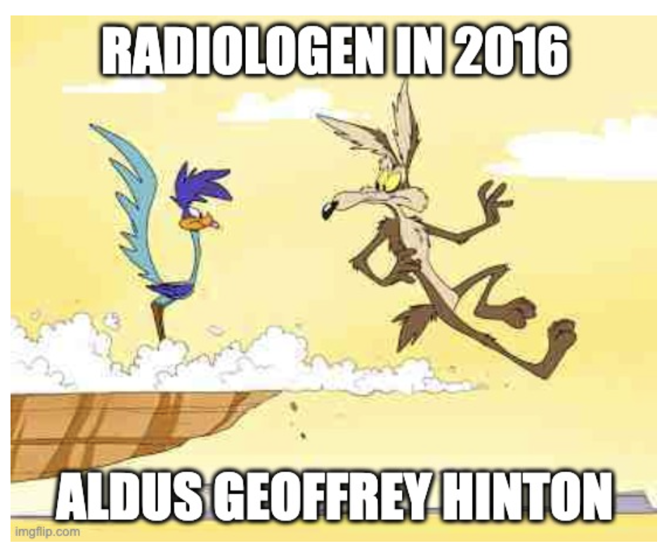 En hoe zit het met het verhaal dat AI doktoren gaat vervangen, dat we al lang horen, onder andere ook van Geoffrey Hinton die in 2016 zei, dat het obvious was dat we moeten stoppen met het opleiden van radiologen omdat ze binnen 5 jaar niet meer nodig zouden zijn, ze waren, zo zei hij toen, als Will. E. Coyote die nog niet gezien heeft dat hij al van het klif is afgerend.
