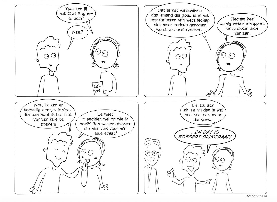 Ik bedoel veel eerder dat in de wereld waarin er AI is, worden communicatie-taken nog steeds niet beloond. Je leidinggevende kijkt er niet naar, en je collega-wetenschappers gaan je helaas niet serieuzer maar juist minder serieus nemen, het Sagan effect. Dus waarom zou je wetenschapscommunicatie doen als je ook gewoon twee papers kan schrijven in dezelfde tijd?