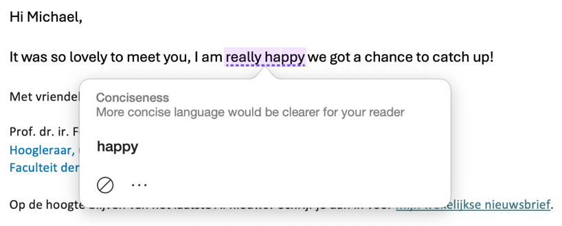 Daar is er weer eentje hoor, als je gaat opletten zie je ze overal. Dit is ook weer zo'n venijnige (in Outlook voor de Mac), dit is toch potverdriedubbeltjes onzin. Alsof Michael (een native speaker met een PhD) werkelijk 'happy' duidelijker zou vinden! En alsof het hetzelfde betekent!